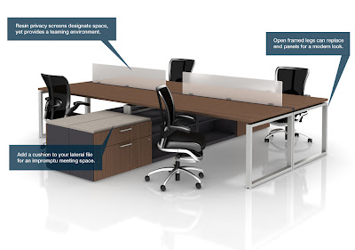 Low profile resin screens welcome successful teaming, while maintaining enough privacy for individual work. Similar to our own set-up, sleek lateral files may be topped with cushions for a place to quickly meet with coworkers and share ideas. This Kimball system can adapt to changing work modes with modular, assembled, and mobile components that come finished in wood or laminate and its versatility allows for a bold design statement “from the lobby to the executive wing and everything in between.”