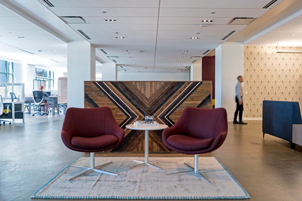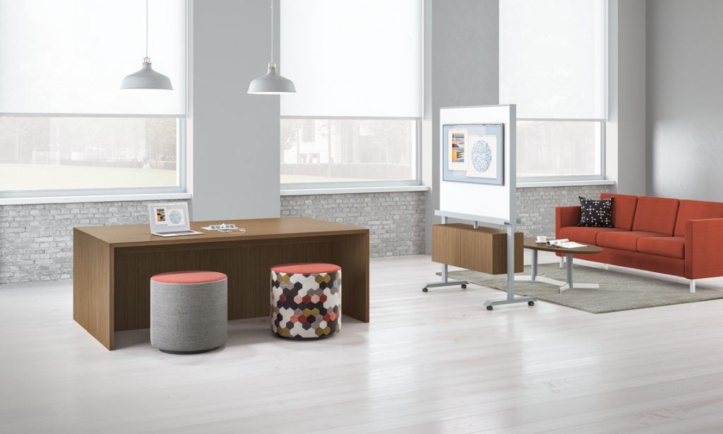 A great way to incorporate Narrate into your current office set up is to upgrade your current open spaces to have more interesting seating. We love the Dwell round Ottoman mixed with a wood coffee table to create a dynamic juxtaposition in colors and shapes – while keeping your space work-friendly.